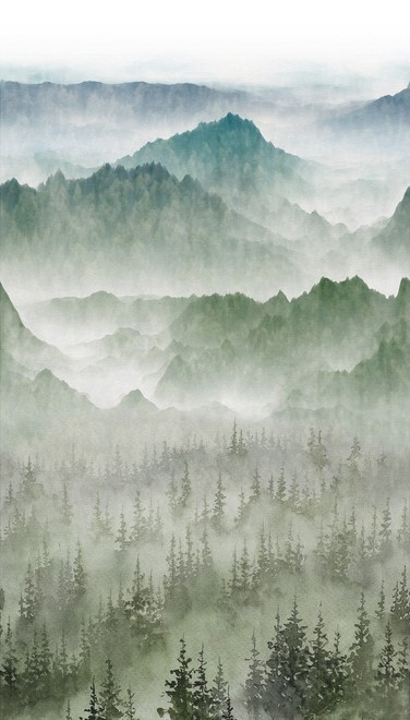 Un pintoresco paisaje con un aire fresco y relajante, una cadena montañosa que se pierde en el horizonte adornada por frondosos árboles. Una composición natural que insufla una atmósfera cálida y nostálgica.