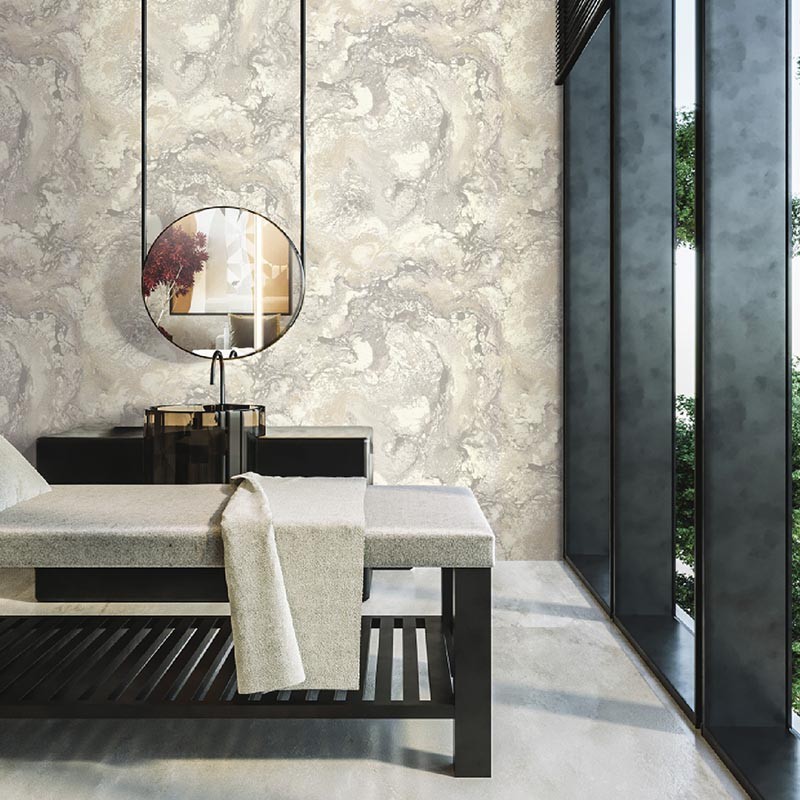 Papel tapiz gofrado, efecto de mármol de Carrara con vetas circulares pronunciadas en color gris