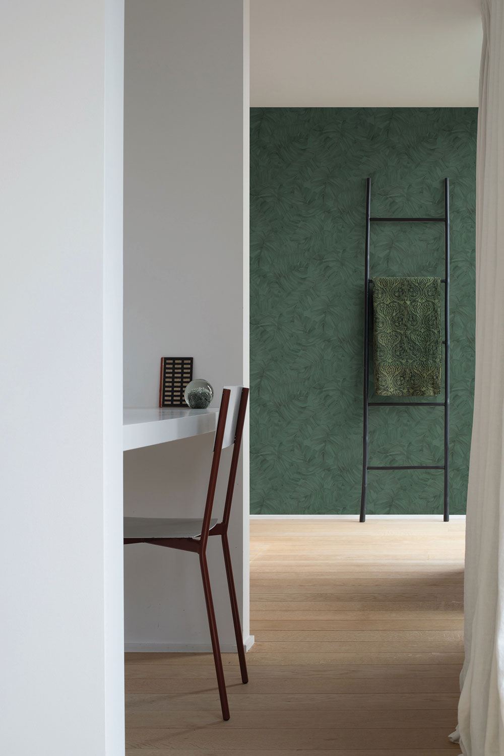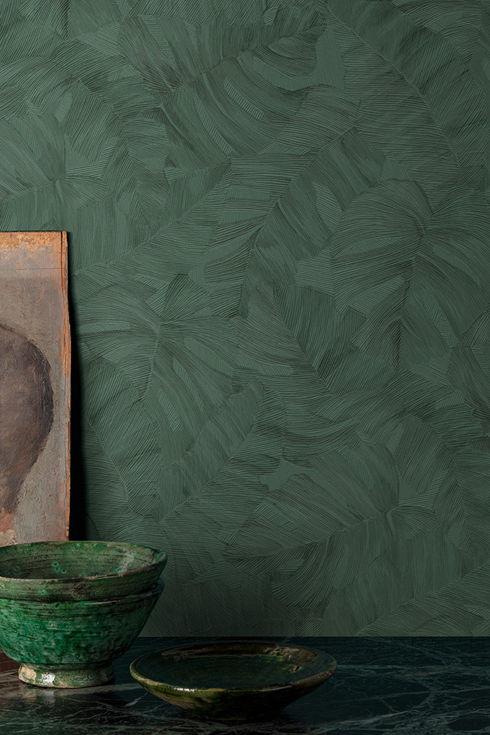 Papel Tapiz vinílico, texturado. Diseño botánico con hojas marcadas con alto relieve.