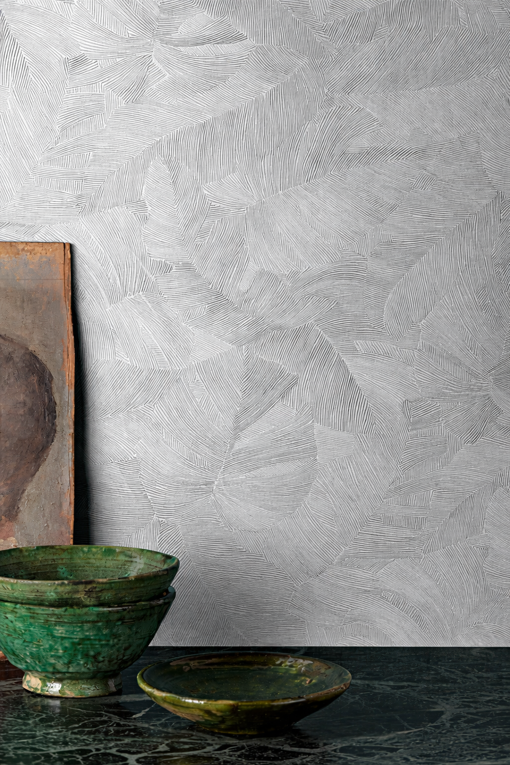 Papel Tapiz vinílico, texturado. Diseño botánico con hojas en alto relieve.