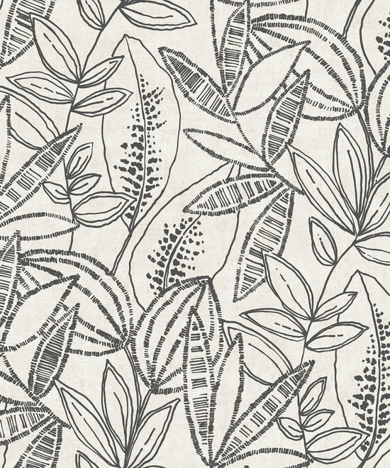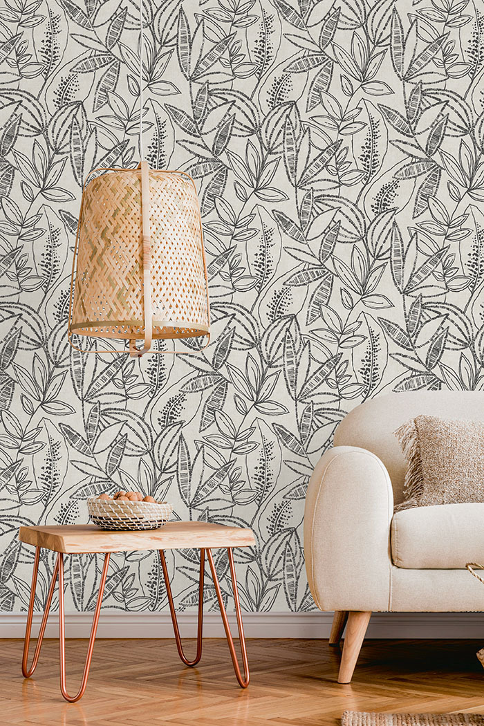 Papel tapiz vinílico, texturado. Diseño botánico con un exuberante collage de hojas y frutos.