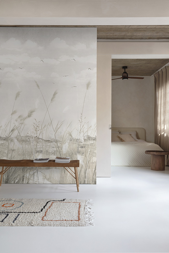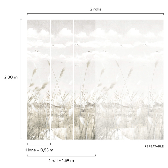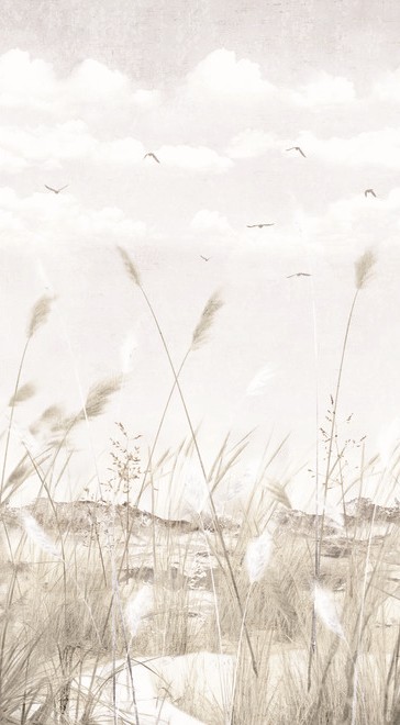 Un paisaje etéreo, con una vegetación de espigas movidas al ritmo de la brisa, las aves coronan el cielo y le otorgan movimiento al paisaje.