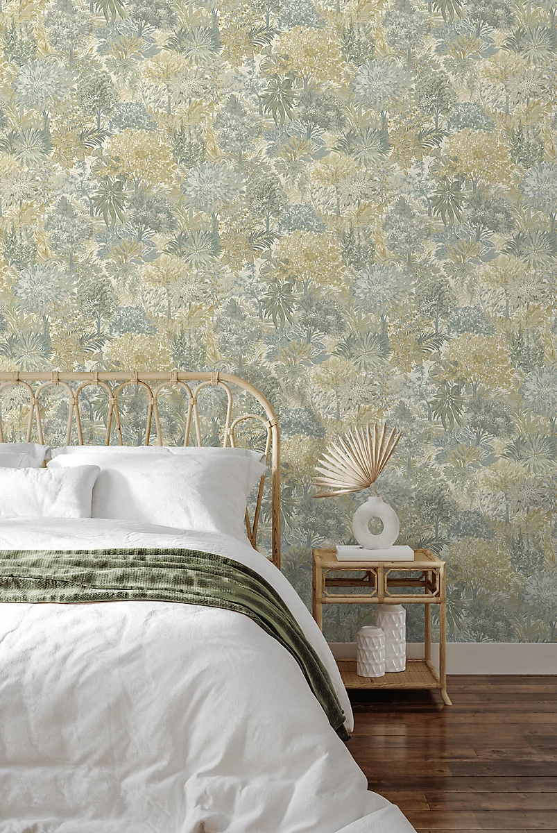 Papel tapiz vinílico, un collage de árboles y follaje con una atmósfera vintage.