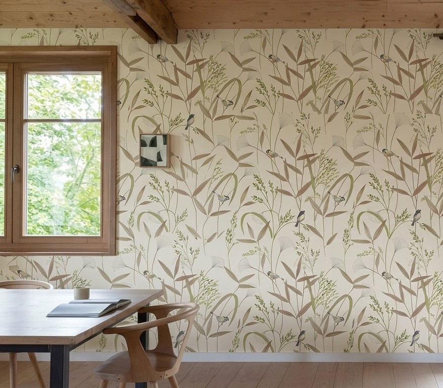 Papel tapiz vinílico, un mosaico de naturaleza con pintorescos pajarillos y delicadas flores silvestres
