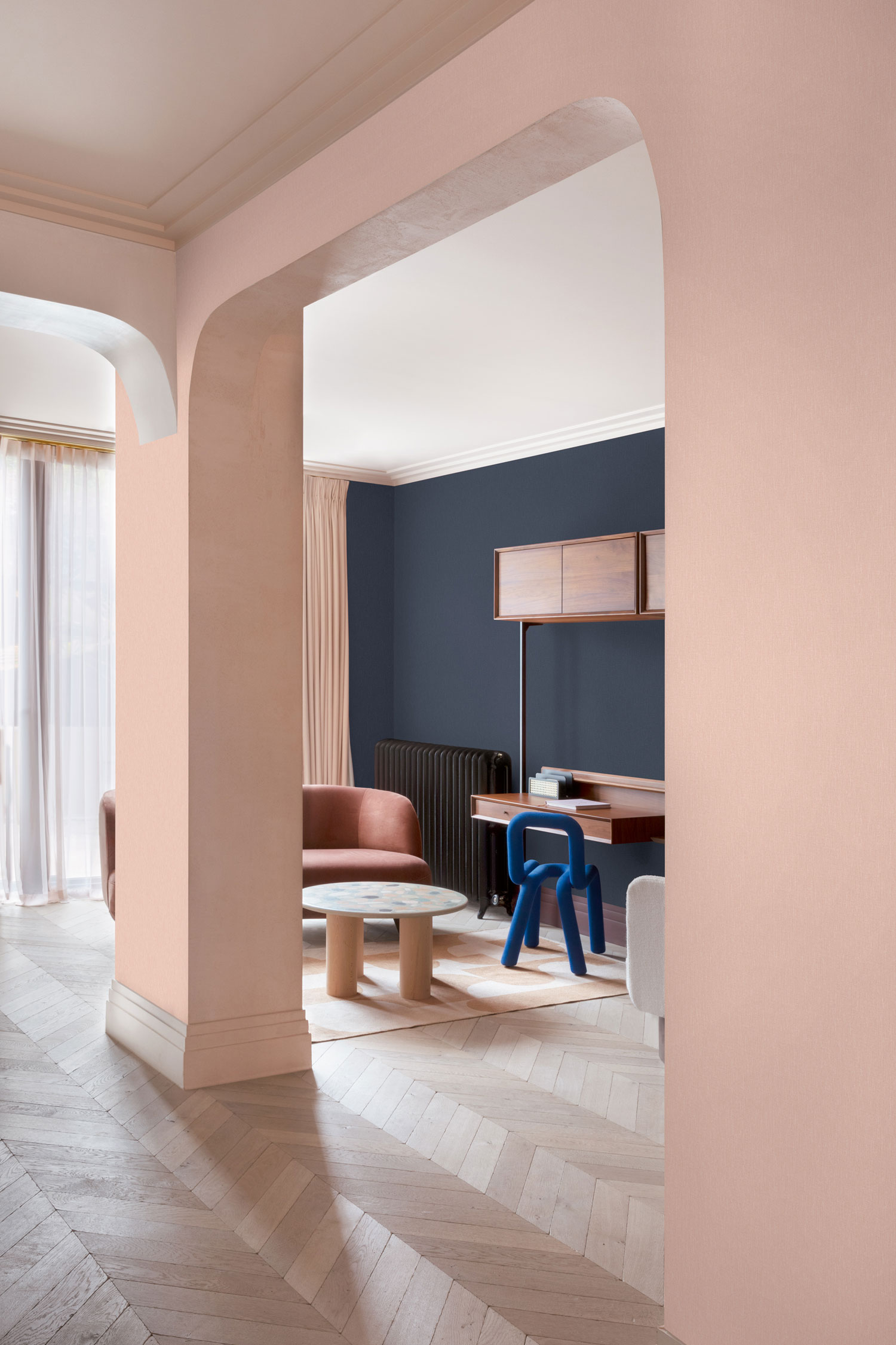 Papel tapiz vinílico, texturado con tecnología Novacoat que repele virus y bacterias, pensado para áreas comerciales y de alto tránsito.