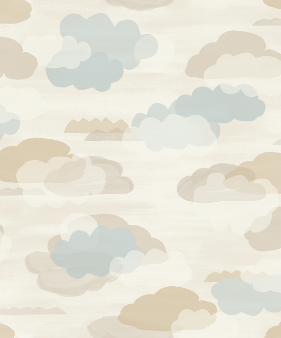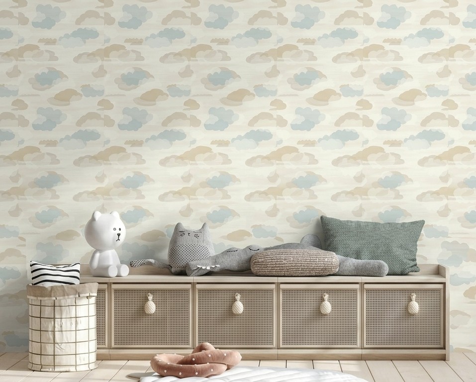 Papel tapiz vinílico, con una composición de nubes en tonos pastel.