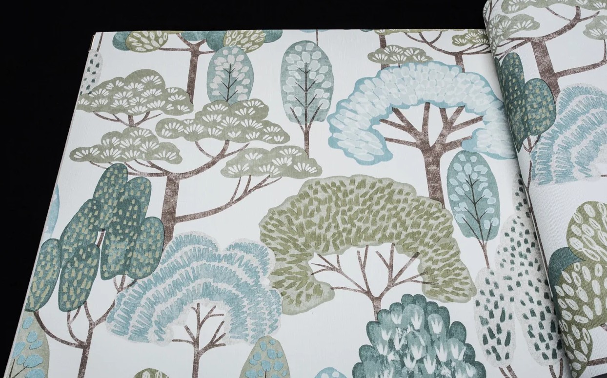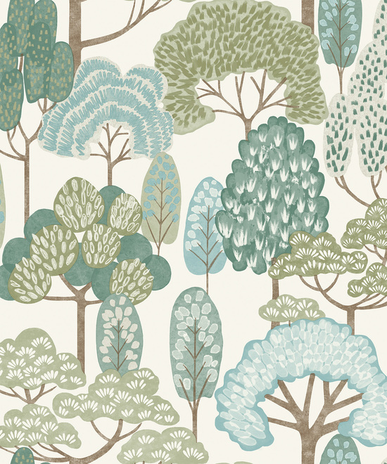 Papel tapiz vinílico, con una composición botánica de exuberantes árboles.
