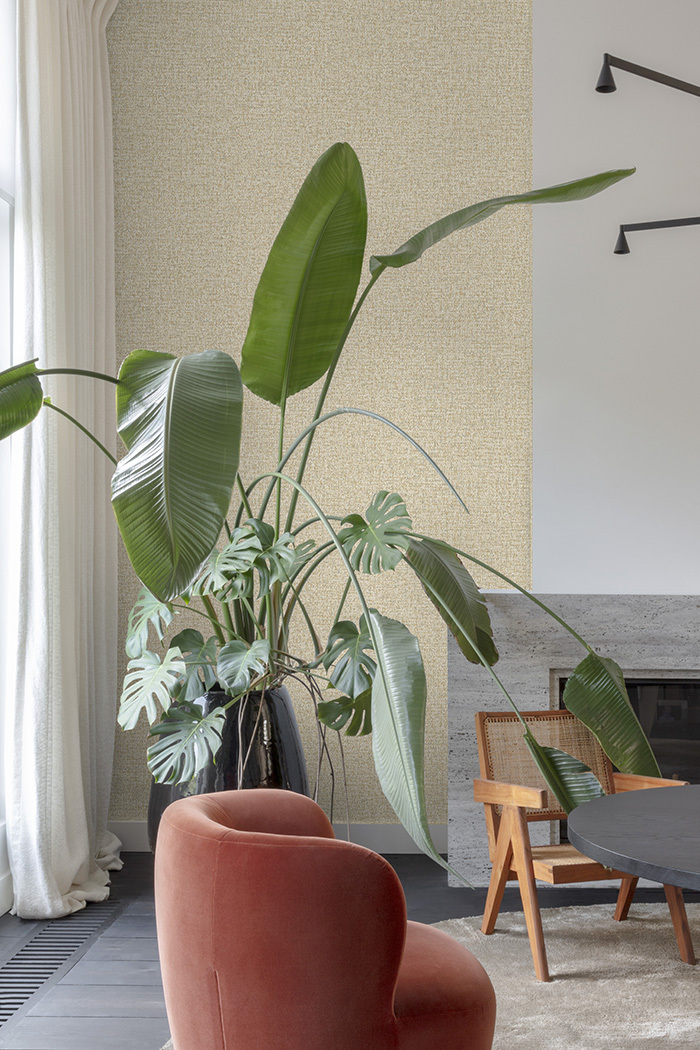 Papel Tapiz vinílico, texturado, este diseño posee un efecto textil con sutiles jaspeados en tonos menta y dorado.
